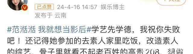 有网友留言说:先学好说念德才学艺,是以祝你不成效。还铭记她在综艺节目中对待素东说念主的格调,知道出傲然睥睨和轻篾的心情。